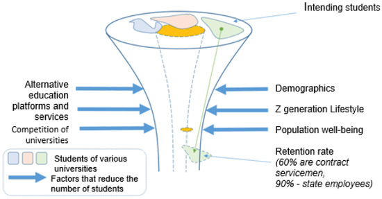 In this respect, the basis for the university ecosystem development includes scientific research results in behavioral economics of education. By combining digitalization opportunities and achievements in behavioral sciences, it is possible to create a conceptually new educational environment, which is flexible not only in terms of external conditions change, but also in terms of needs and abilities of a student. Investigation of behavioral models, in particular, Fogg behavior model [25], and concepts of soft power (nudging) in general [26,27] based on big data in the educational system to create an innovative educational environment, which contributes to the development of a specialist of a different behavior, on the one hand, and allows for saving money due to enhancing the efficiency of educational programs mastering with the maximum possible students retention degree (until the end of their learning period), on the other hand, are deemed as critical under current conditions.