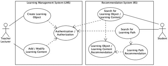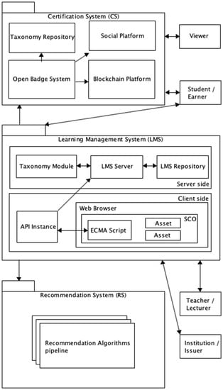In Figure 1 we provide readers with a high-level view of the software architecture for the Digital Brick system. In particular, the figure represents the actors (user categories) and the three main functional components. Among the actors, the Student is interested in earning digital badges and certifications, which are issued by an Educational Institution that provides online courses authored by Teachers. Digital badges and certifications are accessed by Viewers, for example companies that look for new talents to hire. The central component of Figure 1 is a SCORM compliant Learning Management System—of which the main modules are depicted—that provides learning assets, learning objects and courses stored in a repository. The LMS collaborates on the one hand with the Certification System to issue open badges and certifications validated through a blockchain, on the other hand with a machine learning enabled Recommendation System to suggest to students personalized learning contents, learning objects, and learning paths.