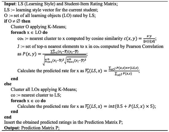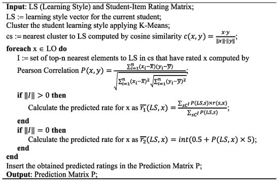 Figure 3 shows the internal architecture of the RS. The RS takes as input from the LMS the Learning Style vectors for each enrolled student, encoded adopting the Felder-Silverman Learning Style Model [33], and the Student-Item Rating Matrix, which stores the rating each student assigned to every learning item he/she evaluated. The RS generates as output for the LMS a list of top-N recommended learning items (a different list for each student). To produce this list, the RS exploits three different collaborative filtering algorithms (AROLS, Cosine Similarity and Pearson Correlation, Matrix Factorization through Singular Value Decomposition), hybridized with a content-based filtering algorithm thanks to three Hybridization Modules. A Recommendation Selection Module compares filtered recommendations and outputs the N most recommended items. Figure 4 provides readers with the pseudo-code of the collaborative filtering algorithm with the Felder-Silverman approach we adopted. Figure 5 shows the content-based algorithm that exploits the Cosine Similarity and Pearson Correlation coefficient approaches we implemented.