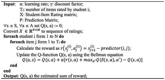 It is possible to formalize the collaborative filtering problem as a Markov decision-making process (MDP) and to optimize the predictions learning form the sequence of contents a student evaluated over the time using the Q-Learning algorithm. Figure 6 provides readers with the pseudo-code of the Q-Learning algorithm. To the best of our knowledge, this is the first time a RL method is applied to collaborative filtering of learning contents in the education domain.