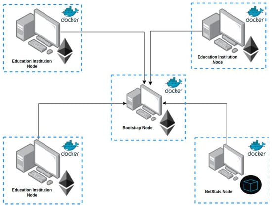 The system test was done in vitro by executing both a functional and performance validation, operating on the CS and the RS separately. Regarding the CS, a private Ethereum software blockchain has been instantiated as a network of Docker software containers (see Figure 7) deploying smart contracts that represent target digital badges. The Bootstrap node creates the whole blockchain, while the NetStats node collects usage statistics. The Education Institution nodes send transactions (i.e., issue digital badges) or perform mining. All custom business logic has been developed using Java and JavaScript programming languages. Concerning the RS, the OULAD—Open University Learning Analytics Dataset [38] has been exploited to extract performance metrics about the machine learning implemented algorithms. OLAUD contains information on 22 learning modules, 20 different types of learning activities, and 32,593 students with their assessment results (10,655,280 records). All machine learning algorithms have been developed using the Python v. 3.9.0 programming language, the Jupyter Notebook online development environment, and exploiting the Numpy (for scientific computing), Pandas (for matrix computing), Sklearn (for supervised and unsupervised learning), SciPy (for statistics and linear algebra), Matplotlib (for data plot), and Seaborn (for data visualization) open-source Python standard libraries. The functions provided by the listed libraries gave us the possibility to calculate and plot the Mean Absolute Error and the Root Mean Square Error statistical measures to evaluate the quality of our algorithms.