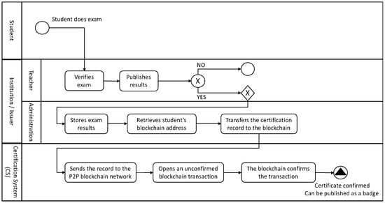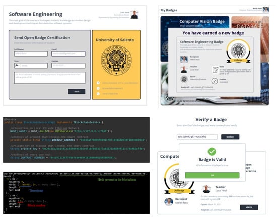 Open Badges are fundamentally digital entities that can be earned both online and offline, and that indicate the learner’s achievements (formal and informal), providing information about the issuing institution [17]. Badges are created, issued and managed through an open-source system, named Open Badge Infrastructure, conceived by the Mozilla Foundation and currently maintained by the IMS Global Learning Consortium [18]. Despite an initial increasing adoption, however, critics have raised many objections as the lack of shared meaning of digital badges [19], their role in the commodification of learning [20], the theory of motivation displacement [21], and other concerns about credibility, reliability and privacy [22]. Attempting to overcome these issues, in particular the lack of content standardization, systematic and shared approach, credibility, reliability, and privacy that are key properties for issuing formal certifications, in the last years, researchers started to integrate digital badges with blockchain Refs. [23,24,25]. Nevertheless, agile, usable and reusable applications still are in their infancy. No general software frameworks are available for institutional organizations.