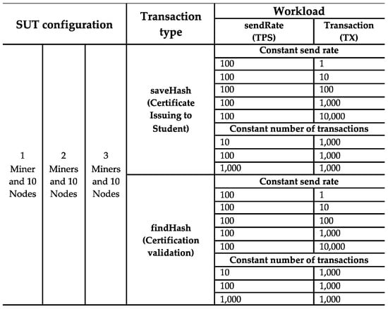 Focusing on quantitative results obtained during the performance assessment of CS, as Figure 12 shows, we achieved a better indicator in terms of transaction latency and transaction throughput than the Ethereum single node blockchain as reported in Ref. [40] we compared our solution with. As an example, for a number of transactions of 103, the transaction latency of our solution is better than Ethereum single node by 61.96% with one miner node and by 28.36% with two miner nodes, respectively. In the same configuration, the transaction throughput is better by 48.54% (one miner node) and by 4.36% (two miner nodes). We also measured that the CS we deployed is able to handle a higher maximum number of concurrent transactions than the Hyperledger Fabric node discussed in Ref. [40], but lower than the Ethereum node (the Hyperledger Fabric is an implementation of a private blockchain technology that is intended as a foundation for developing blockchain applications for a wide variety of industry [41]). In fact, our CS is able to process a maximum of 27,732 concurrent transactions compared to 20,000 maximum concurrent transactions of the Hyperledger Fabric and 50,000 maximum concurrent transactions of the Ethereum blockchain; however, although the maximum number of concurrent transactions can be a critical parameter in the financial domain to exchange cryptocurrency, it is not in the educational sector.
