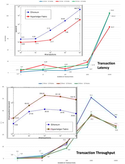Quantitative results for the CS have been extracted by performing a stress test of the Ethereum blockchain as depicted in Figure 7 (SUT—System Under Test). To verify the ability of the SUT to perform correctly issuing and verifying certifications, as reported in Figure 11 we defined a representative workload for blockchain in three different configurations (1 miner node and 10 actor nodes, 2 miners and 10 actor nodes, 3 miners and 10 actor nodes), with an increasing number of transactions (i.e., certifications issuing or verification), or with an increasing rate of transactions. Using the Hyperledger Caliper blockchain benchmark tool, we measured the transaction latency and the transaction throughput. The transaction latency L = tc − td is defined as the difference between the transaction completion time (the moment in which a transaction is confirmed by blockchain) and the transaction deployment time (the moment in which a certification has been issued or verified). Whereas the transaction throughput Th = the number of committed transaction (tx)/total time (s) is defined as the number of successful transactions per second starting from the first transaction deployment time. Figure 12 provides readers with quantitative results for latency (top) and throughput (bottom) referred to the certification issuing use case at an increasing number of transactions. For lack of space, we do not report similar results for the certification verification use case and at an increasing transaction rate. On the top left and bottom left of Figure 12, Ethereum results (dashed line) are compared to the state-of-the-art (solid line) represented by the Hyperledger Fabric system [39].