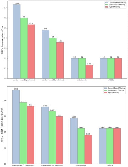 The first and the second histogram chart starting from the top of Figure 13 show us that the diverse algorithms we implemented have different accuracy performances in predicting learning contents and learning paths to recommend to students. In particular, moving from content-based filtering (CB) to collaborative filtering (CF), in general the accuracy increases as both MAE and RMSE decrease. Combining CB and CF with the hybrid filtering (HF) strategy, we obtained better performances in all test scenarios we considered. For this reason, our machine learning architecture includes hybridization modules (see Figure 3).