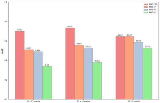 Figure 13 reports MAE and RMSE measures we collected during our tests. Starting from the top of Figure 13, the first histogram contains MAE values for (i) the content-based filtering algorithm, (ii) the collaborative filtering algorithm, and (iii) the hybrid filtering algorithm, respectively, referred to the four scenarios. The second image (middle) contains RMSE values for the same algorithms. In the third histogram (bottom), we present three series of MAE values for recommendations done using different dimensions of student-item rating matrices (15 × 15, 15 × 10, 15 × 5). The fourth bar of each sequence is referred to the reinforcement learning Q-Learning algorithm (QL).