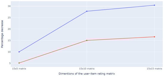 To be more precise, using QL we obtained an improvement of the MAE index by 10% for a 15 × 5 student-item rating matrix, by 27.7% for a 15 × 10 matrix, and by 30.2% for a 15 × 15 matrix. In relation to the RMSE, the percentages of improvement we measured have been by 5%, 10%, and 16.8%, respectively. We plot the accuracy improvements due to the Q-Learning algorithm in Figure 14.