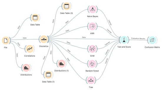We used the Orange data mining (DM) tool for each step of the KDD process (Figure 1). The tool is useful for visual programming and explorative data analysis and can be written in Python. Orange has multiple components known as widgets [51] which are dragged–dropped and connected to each other for the KDD procedures. In our predictive model, we applied the steps of the KDD process. These steps are explained in the following section.