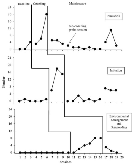 Yan. Across all of Yan’s baseline sessions, there were two occurrences of target behaviors. Following the introduction of training, narration data indicated a therapeutic accelerating trend with the mastery criterion reached in six sessions. Imitation data reflect an absolute change in level from zero to four occurrences with mastery criterion achieved in three sessions. EAR data were initially variable across coaching sessions resulting eight sessions until Yan mastered the behavior. Similar to Ann, maintenance data for previously mastered behaviors mirrored baseline data levels while Yan was receiving coaching on a new behavior. Across the final three maintenance sessions Yan’s data were at or below mastery criteria levels and above baseline level responding (range 1–4 occurrences). These data reflect a functional relation between the brief coaching package and Yan’s engagement in the target instructional behaviors.