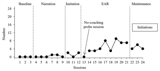 To estimate the association between parent engagement in naturalistic language strategies on children’s initiations, we created multi-level models using a time series analysis framework specific for analyzing data collected within single-case experimental designs (see [19]). All models were created in Stata version 16.0; syntax for all models is available for use and review upon request. The first level of the models reflects each measurement occasion (i.e., session), and the second level reflects each single-case design (i.e., parent–child dyad). Four continuous predictor variables were included throughout the models. Sessions indicated each measurement occasion, Narrations indicated the number of narrations performed by parent, Imitations indicated the number of imitations implemented by a parent, and EAS indicated the number of times a parent engaged in an EAS. The outcome variable for each model was the number of initiations that a child engaged in throughout a session (Initiations). Five models were created. Model 1 contained only the Sessions variable, as this provided an estimate of the linear trend present in the children’s initiations throughout the study. The Sessions variable was retained in all created models as a control for the trend present in the data. Models 2–4 contained the other predictor variables, with each entered individually, along with the Sessions variable. These models provided an estimate of the association between parent engagement in each instructional strategy and child initiations when controlling for the trend in child data. The final model (Model 5) contained all predictor variables and provided an estimate of the association between parent engagement in each instructional strategy and child initiations when controlling for the trend in child data and parent engagement in each instructional strategy. Based on recommendations from Ferron et al. (2009) [20], first-order autoregressive model was used to model the first level error structure in each model. Although included in the framework discussed by Declercq et al. (2020) [19], we did not model each predictor variable as a random effect due to a lack of variance attributable to the second level of the models, which resulted in our software program failing to report variance statistics; average estimates of effect were unchanged regardless of including predictor variables as random effects.