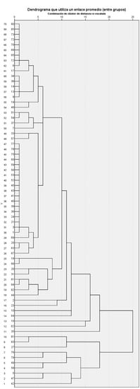 These results suggest that there could be a group of students with a clear tendency to respond with a negative attitude throughout the questionnaire, or the individuals who present negative attitudes differ between items. The cluster analysis reveals a distribution or grouping of the sample into two groups, as can be observed in Figure 2. For this analysis, it makes sense to use fully completed questionnaires, which leads us to discard 15 that have one or more unanswered items.