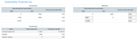 The environmental tax is progressive, and it is calculated on the basis of manufacturing volume; the unit of the tax amount increases in ranges within the increasing manufacturing volume. The mechanism for determining the environmental tax in the game, based on the scenario of manufacturing electric scooters, is presented in Figure 2. The tax is deducted after each turn, and it reduces the company’s income for that turn. The teacher conducting the game receives full information about the amount of tax calculated for all playing teams and can change the range levels and tax rates applicable for the next turn.