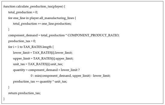 Figure 3. The pseudocode of the algorithm for calculating the environmental tax in the BizArena business simulator.