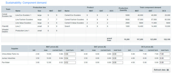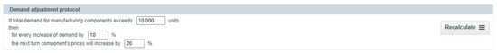 In this scenario, three components are required to manufacture electric scooters: MAT (materials), BAT (batteries), and DES (design). The components are provided by three suppliers, where each supplier has a different price for each component. The range of price changes is specified by the initial and max values. The final price for the next turn is determined on the basis of the grand total demand generated by all players in the current turn. The component pricing protocol is presented in Figure 5.