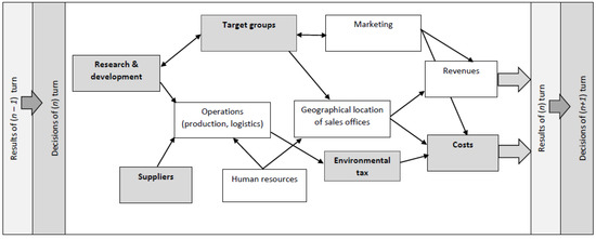 Figure 8. The logic of the sustainability-oriented version of the BizArena business simulator (sustainable aspects highlighted in gray and bold).