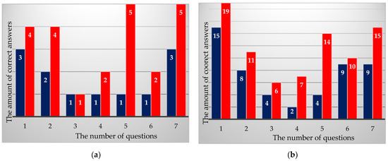 Summary of pre-test (in blue) and post-test (in red) for Group A in graph (a) and for Group B in graph (b).