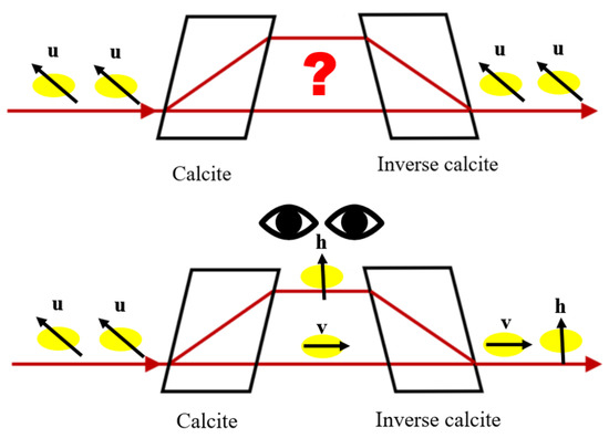 - Rethinking some previous tasks about trajectory would also be helpful after becoming acquainted with the superposition principle at the end of the curriculum. Earlier, students discovered that if we place another inverted calcite behind a birefringent calcite crystal, it unites the beams, and the polarization of the transmitted photons will be the same as that of the incident beam. However, if we theoretically make a measurement between the two calcites, the outcome will change, so we can help students distinguish the property from the state. The schematic diagram illustrating the problem is reproduced in Figure 2.