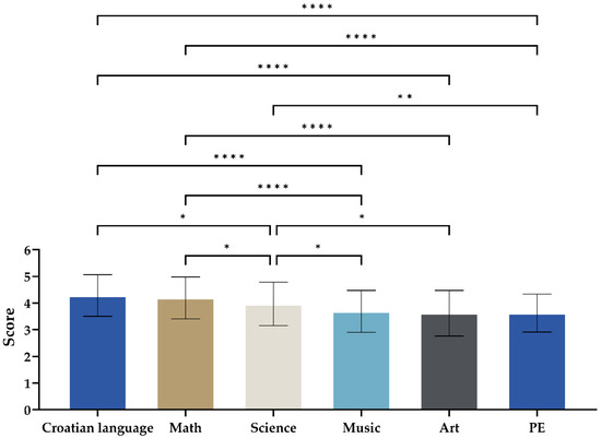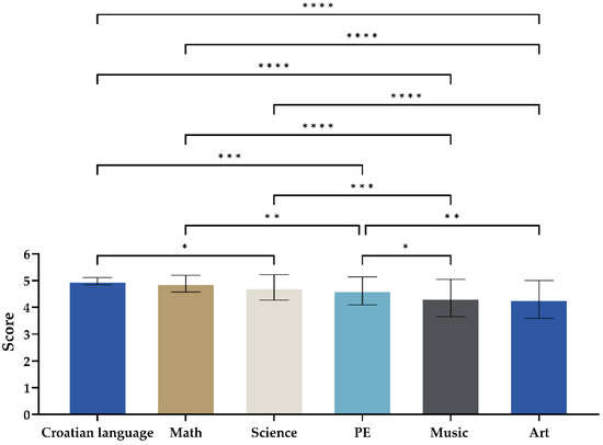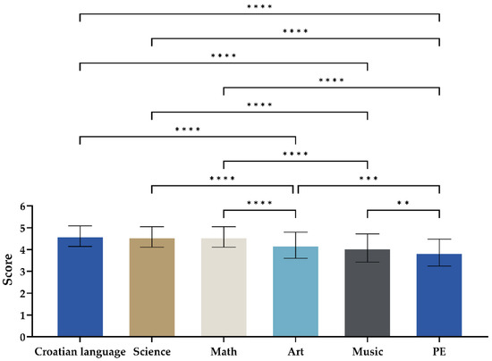 All assessments of the importance of classroom subjects are relatively high (all average values are above 4.00), which indicates that teachers recognize (acknowledge) the significanceof each classroom subject in the curriculum of lower grades of primary school. Teachers consider core academic subjects (Croatian language, Mathematics, and Science) more important than practical and artistic subjects (PE, Music, and Art). PE is ranked fourth, which makes it the closest to the core academic subjects of all the practical and artistic subjects. These findings are confirmed in two studies by Maulini et al. [22,23], where teachers had similar attitudes toward practical and artistic subjects. In comparison, in some countries, PE is ranked much higher where the importance of teaching via movement is shown in certain nations by the fact that PE instruction begins in the first grade of nursery school. This is the case in Denmark and France, where psychomotor training is included in the nursery school curriculum [35].