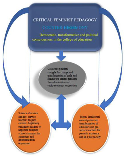In transforming women and girls from economic and intellectual oppressive contexts, the concept of counter-hegemony could be rekindled. Counter-hegemony is a collective and political struggle aimed at re-arranging or packaging the science, technology, engineering and mathematics classroom interactions for conceptual understanding, creativity, and the democratic and emotional transformation of teachers and students [23]. It thus enables possibilities for peaceful co-existence and intellectual empowerment through power sharing that could revitalize democratic and critical consciousness [42,43]. Rethinking counter-hegemony, a tenet of feminist reproduction theory in science, technology, engineering and mathematics education would position science educators and pre-service teachers in the colleges of education to use personal power and gender, then transform into a collective political power and for intellectual freedom and economic development. Furthermore, the critical feminist reproduction model could mediate and bring about the action between a normalized version of inequality and lived experiences of females/males’ subjugation in the complex social world and in science, technology, engineering and mathematics education, including STEAM. This pedagogic model may likely produce critical insights, reflections, equality actions, and emotional transformation of both individuals and the broader society where dominant epistemological stances continue to marginalize and subjugate individuals. This approach resonates with critical pedagogues’ assertion that oppression can only be dismantled if the oppressed are aware of the problem, do not remain silent, and decide to subvert the mechanisms that reinforce inequalities in society to come out of their marginalization and dehumanization [23,44,45]. We align our thought with Morris et al. [1] who argue for a need to expose cultural, historical and economic limitations and address such silences making historical, political, socio-cultural norms and power dynamics more visible in the classroom. In this light, the end point of science, technology, engineering and mathematics education is critical thinking for the transformation of power relations through critical awareness and engagement to reflect on and ultimately change the world for peace and sustainable development [46,47]. Next is the research methodology that was actioned.