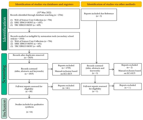 The selection of contributions was carried out in three main steps: (1) identification, (2) screening, and (3) inclusion [23]. The search terms from Table 1 were used in the identification phase and a literature search of the three databases listed yielded 2766 entries. After limiting the search to secondary school, the number of articles was reduced to 1910. Excel served as the software to manage the references and remove duplicate entries. After removing 91 duplicate entries, 1819 entries were screened. We then manually screened the titles, abstracts, and keywords of the remaining 1819 reports based on our ICs and ECs and found 80 potentially relevant studies. In addition, we found 3 potentially eligible datasets by content referencing the included data. Of these, two were excluded based on the inclusion and exclusion criteria after screening of abstract and title. One article was included in the full-text screening.