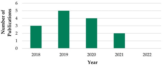 When looking at the publication years, it is noticeable that they are not continuous. There is even a downward trend in Figure 4, although this interpretation should be treated with caution due to the low number of documents. It is noticeable that no document was included that was published in 2022, although the data were included up to the middle of the year (31 May 2022).