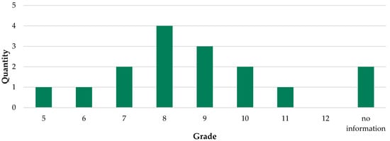 The secondary grades were almost all represented except for 6th and 12th grade, with middle school being particularly prominent. This is shown in the following Figure 6. In the case of authors’ statements about several grades, we included them individually in the survey so that, in total, we arrive at a higher number than the number of documents considered. One unit grade was assigned to each of the grades: 5, 7, 10, and 11. Two units referred to a ninth grade and three to an eighth grade, which was, thus, the most frequently present. No explicit unit was indicated for grade 6. Furthermore, there were two documents that gave no indication regarding grade level. The small number in fifth and sixth grades is due, in part, to the fact that we excluded elementary schools in our analysis. It should be noted that in various school systems, elementary school continues up to and including the sixth grade.