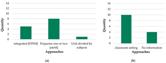 We now attempt to use the results of the subordinate questions to answer the second research question. First, we considered the question of access to STEM implementation. Here, it became clear that STEM is implemented primarily with the emphasis on one or two subjects, as shown in Figure 7a. This corresponds to a medium level of integration, as the subjects are not integrated equally.