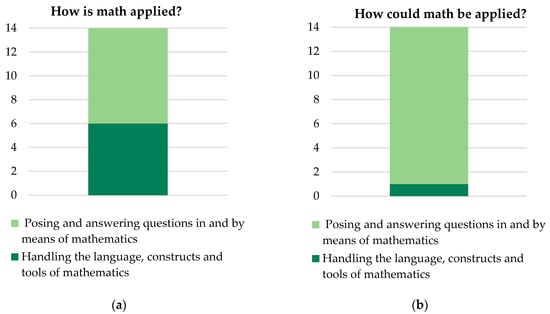 The results are shown in the Figure 8a below. In six (43%) of the incorporated documents, the focus of the application of mathematics was on handling the language, constructs, and tools of mathematics. In contrast, the focus of eight (57%) manuscripts was on posing and answering questions in and by means of mathematics.