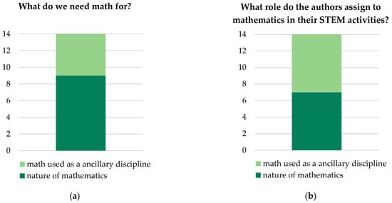 We have contrasted this with the view of authors of the investigated publications shown in Figure 9b. In distinguishing the necessity of mathematics and the necessity of mathematics from perspective, we proceeded analogously to the previous categories. In this perspective, mathematics is more often seen as an auxiliary discipline than used. For example, one author of the investigated publications attributed only the ability to calculate the resistance and the application of Ohm’s law to mathematic literacy in the whole unit shown in column three in Table 5 [39]. The purpose of the article was to develop a sequence for eighth grade and measure the effect on STEM literacy. Therefore, the authors divided the developed STEM literacy in the disciplines. Some disciplines are repeatedly presented because the developed STEM literacies are listed in chronological order.