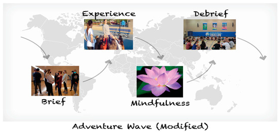 One prominent outcome from this investigation was reconceptualizing a popular experiential learning model to include MPs as a pedagogical “bridge” between the experience (hands-on activity) and debrief (group processing) during the ABL content. The Adventure Wave model consists of three primary instructional activities: brief, experience, and the debrief [36]. Each of these three components create a powerful learning opportunity for participants. We positioned the MPs to take place immediately following the experience and prior to the debrief session with the participants. Figure 6 illustrates a modified adventure wave that includes the MPs. We claim that the MPs helped the learner expeditiously transition from high-energy, hands-on activity to a calmer, more focused state. Thus, the participants were primed and ready to enter the group processing session of the debrief. The MPs had a plausible impact on course pedagogy, helping students to perceive greater focus/attention and equanimity or emotional balance regarding their overall disposition. This assertion aligns with previous research suggesting that MPs can influence emotional well-being, including more focused compassion among student populations [54].