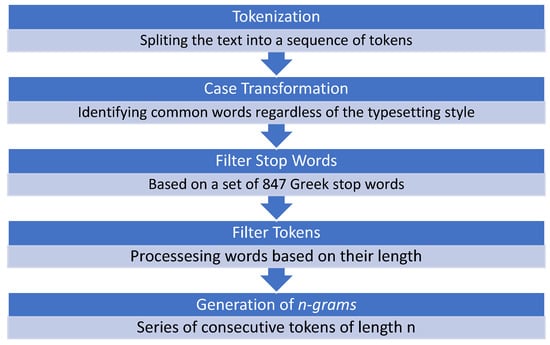 The fourth process, Filter Tokens, processes the words on the basis of their length (i.e., the number of characters each word contains). In the present implementation, three characters were set to be the minimum limit and 9999 characters the maximum. This was used to remove any very small size (less than three characters) left tokens (words), even after the third process application. None of the tokens from the above example are removed. In the Greek language, there are no two-character words that make any sense. All such words are included in the list of the Greek stop words we used and have already been removed in the previous step. This low limit has been set to exclude stop words possibly not included in the used list. The high limit was an arbitrary number to ensure that words of all lengths would be processed.
