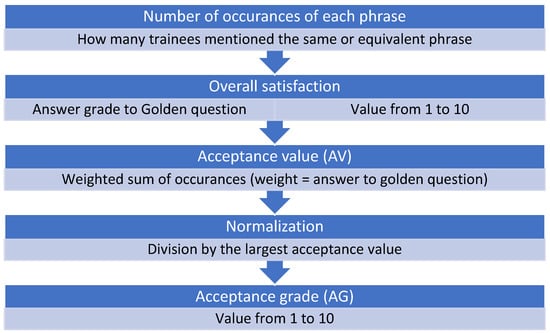 For instance, the phrase “e-learning_made_easy_monitoring_progress” is one of the many different phrases that trainees use when answering the golden question. Let us suppose that the above phrase was included in answers to open questions of two (2) trainees who gave a 7 as an answer to GQ and one (1) trainee who gave a 4 to GQ. So, the phrase “e-learning made easy monitoring my progress” (let it be represented by px) has an acceptance value AVpx = 2 × 7 + 1 × 4 = 18. To get a normalised version, we define acceptance grade (AG) as