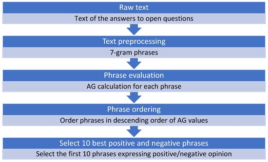 In the first step, the raw text of the answers of the trainees to the open questions is provided. In the second step, the text preprocessing described in Section 3.1 is applied, resulting in the production of the 7-gram phrases. The decision to produce only 7 grams came from the observation that grams with n < 7 could not provide a basis for a meaningful phrase in the Greek language. This may change for another language. Afterwards, the AG of each 7-gram phrase is calculated. In the next step, phrases are ordered in descending mode with regard to their AG value. Finally, the first 10 phrases that indicate a positive or negative opinion about the course are identified and distributed in two groups, the positive group and the negative group (see next section).