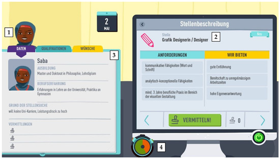 The like2be Gameplay. (1) Applicant, (2) job or training position, (3) applicant’s CV, (4) specified time (game round).