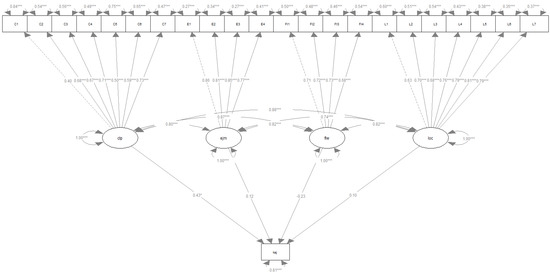 Fourth, we created the final adjusted model, including the four subscales (factors): (1) Cognitive learning process (seven items, Cronbach’s α = 0.81), (2) Enjoyment of the game (four items, Cronbach’s α = 0.89), (3) Flow during the game (four items, Cronbach’s α = 0.80), and (4) Learning outcome (seven items, Cronbach’s α = 0.89). The fit indices of the final adjusted model (see Table 5) also showed that the model fit sufficiently. Thus, the CFI was >0.95, the RMSEA was <0.06 and statistically not significant, and the SRMR was <0.08, which, according to Hu and Bentler [74], is a good model fit. Also, in terms of parameter estimation, the model contained no negative variances, and the standardized loadings between the items and the factors were high throughout the model; the loadings within the factors were similarly high (see Table 6).