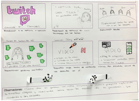 Another important issue is that, in the construction of prototypes, if more advanced and improved versions are to be achieved, dimensions such as creativity, the application of knowledge, and experimentation will undoubtedly play an important role. This experimentation will involve trial-and-error testing, error analysis, and redesign. That is why, in the laboratory under study, the moment of model construction and subsequent testing play a fundamental role. Hence, a video presentation of each of the prototypes (with a maximum duration of 3 min) will be made, in which the teams will have to identify and solve technical problems during its creation, while at the same time, they will have to transfer technological, audiovisual, digital information, or media knowledge in a creative way to the new situations linked to the sociocommunity. To mediate in this prototype design process, each group elaborates a storyboard of the laboratory video prior to its recording, as illustrated in the following Figure 2.