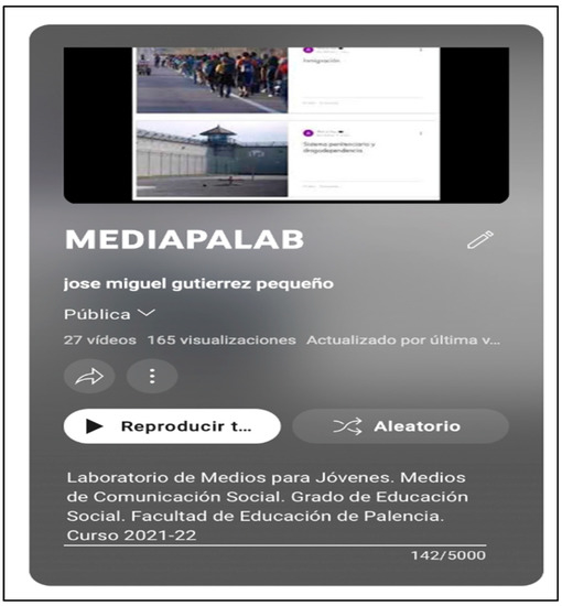Finally, an important aspect will be to make the different projects evolve, in this case through a series of steps taken within the laboratory, in order to engage others and build community, which are undoubtedly essential aspects of any project based on the design of prototypes and are even more important, if possible, in the case of the initial training of social educators. Therefore, now is the time to seek to expand the potential of the prototypes generated through design dissemination processes, either because the working groups seek to share their ideas or stories or because they intend to engage others in the projects, and even because they think in terms of future differential employability in light of the characteristics of each prototype and the audiences they intend to reach in communicative terms. Therefore, the last element to be orchestrated by the laboratory will be the dissemination of the different projects developed. To this end, all the videos of the social media labs have been uploaded to a YouTube MediaPaLab channel (https://www.youtube.com/playlist?list=PLcaTa04HAxMYKSB-BTPbsZ8OIyxEGQcPu, accessed on 10 December 2022). At the same time, it will be publicized through the different social networks and platforms of students and teachers, as well as on the website of the media Lab of the Recognized Research Group Citizenship, Ecologies of Learning and Expanded Education (CEAEX) of the University of Valladolid (https://ceaex.uva.es, accessed on 10 December 2022).