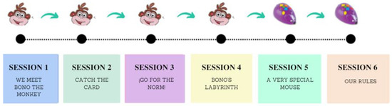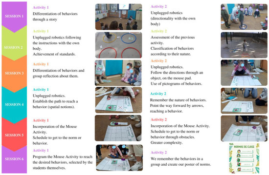These activities focused attention on developing good habits and standards of conduct, for which robotics is the vehicle used to respond to the needs detected. Specifically, we worked with robotics adapted to the age of the participants. Educational robotics facilitates integral development, which is essential in this stage, increasing the interest for the content and attaining a more inclusive context [50]. We started with unplugged playful activities and continued with activities using the Mouse Activity floor robot. Figure 1 shows the sequence of sessions that make up the educational proposition.