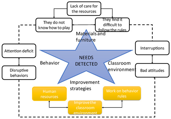 As can be observed in Figure 3, the needs detected in the interviews show three clear dimensions that were influenced by the identified behaviors: (1) classroom environment, which was negatively affected by the constant interruptions; (2) the lack of care for the resources, as the children were not interested in learning how to use them and they found it difficult to follow the rules; and (3) disruptive behaviors, such as hitting or insulting, which also involved attention deficit. To sum up, the interviews revealed needs that were always linked to bad conducts and the establishment of rules, which caused interruptions, attention deficit and a lack of skills in group play. In both cases, the interviewees agreed that, in order to address these needs, greater support is necessary, as well as working specifically on the knowledge of behaviors and improving the classroom environment.
