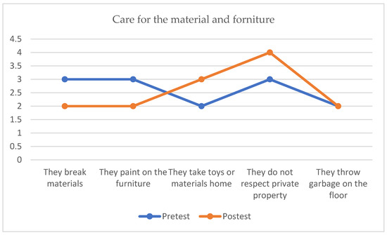 As can be observed in Table 2, most of the students did not respect the materials or the furniture. They frequently threw garbage on the floor or broke materials without respecting their ownership. Regarding the act of taking materials home, although it occurred in some cases, this was not a generalized behavior in the group.