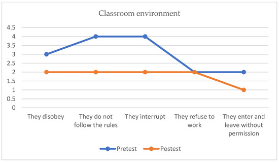 Figure 5 presents the results of the dimension “classroom environment”. As can be observed, improvements were obtained in all variables. This is the dimension that showed the best results with respect to the data obtained in the pre-test. It is worth highlighting that, after the intervention, the children almost never interrupted the teacher or refused to follow the rules, and they never entered or left the classroom without permission.
