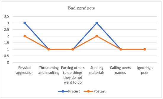 Figure 6 gathers the pre-test and post-test of the dimension “bad conducts”, where “physical aggression” and “stealing materials” were frequent. The greatest improvements were achieved in these two variables.