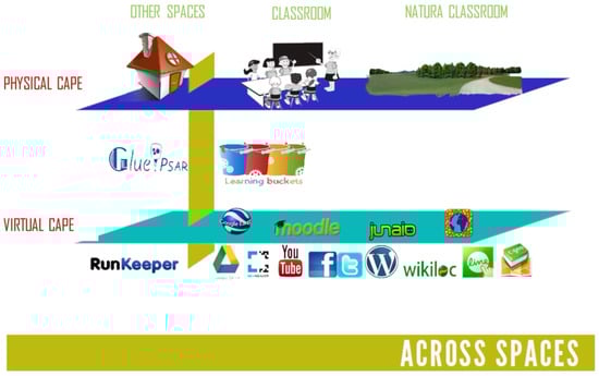 The second example, from a few years later, is a study on mobile learning. It is framed in the context of research carried out between 2014 and 2017 [6,7]. This example of innovation consisted of the application of different learning processes in mobility where the space became a part of the classroom. In a specular process of carrying out activities outside the classroom, as if it were a mirror, these activities ended up including in the classroom and were transferred as part of the training activity. This example provides an illustration of how by using the “project technique” [27] it was possible to develop several technological planes that facilitated the connection of spaces in teacher training. In this particular case, initial teacher training and the implementation of an innovation process in a practice school were connected. This type of process allows learning with the support of technological tools and virtual learning environments that facilitate, expand and enrich learning itself in a natural setting outside the classroom. Additionally, the incorporation of technological resources and collaborative activities involved the use of the mobile devices of the students/school. More specifically, a research framework was constructed by using two technological platforms, GLUEPS-AR and LEARNING BUCKETS [29,30], which integrate through VLE (Moodle) different resources, including Augmented Reality (AR-Augmented Reality) and other web-based tools.