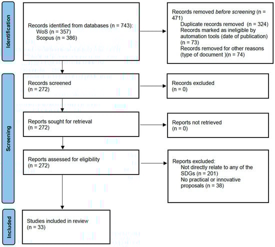 The four researchers, first independently and then by consensus, acted in the different phases of selection according to the criteria for prior inclusion and definitive inclusion in the review. To reduce bias, each study was coded with a rating of “1–5, where 5 is the maximum rating” according to the evaluation of each researcher. The criteria used were the following questions: Are the instruments and the research process described? Are the results argued? Are there references to any SDGs? Figure 1 (PRISMA flow diagram) summarises the procedure followed.