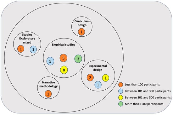 Only 4 studies do not refer to the use of samples. In relation to the others, the most frequent are those using less than 100 participants (30.3%), followed by those studies with samples of between 300 and 1500 subjects (27.3%). In third place are those with a sample size between 101 and 300 participants (21.2%), and at the end are those using more than 1500 subjects (9.1%). Figure 2 summarises the methodologies used and the sample size.