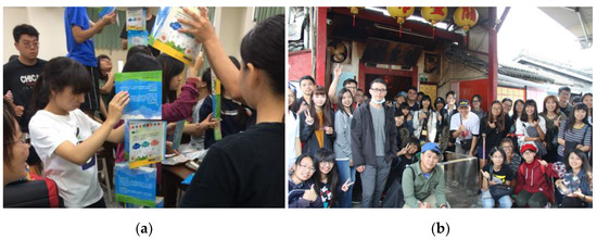 The first task in the design process is to understand the essence of the problem [19], which can be discovered through images, forms, textures, colors, sounds, and smells. In this course, the students visited communities to have a practical experience of their rich humanistic, environmental, industrial, and landscape features. Mini getaways were also arranged to help the students discover Dalin’s local features and cultural stories. Mr. Chiang himself took the students on a guided tour around Dalin, during which he explained the stories behind the featured attractions and friendly community spaces. The classroom activities consisted of a series of exercises combining creative thinking and cultural elements. The training sessions included topics such as figurative and audio associations, observation and imagination, complexity and simplicity, biomimicry, etc. Through these activities, the students activated their boundless thinking and interacted and discussed with one another to create interesting concept maps. The students were further guided to participate in knowledge construction and exploration experiences during which they fostered their independent thinking skills through visual observation, hands-on experiments, and brainstorming. Their independent thinking skills were a major driving force behind the efforts they invested in the process. The educational settings for this unit are presented in Figure 4.