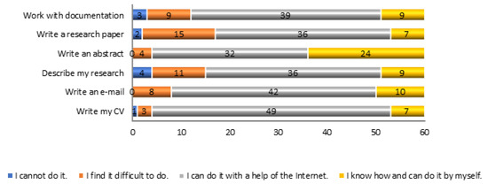 The students have some background knowledge, as they studied a General English course and an ESP course within their bachelor’s curriculum. Figure 1 and Figure 2 show that most of the surveyed students are aware of multiple activities they are likely to perform in English in their future professional life. However, most of them find it difficult, or can only perform the activities with a help of the internet (downloading a text, using Google translate, etc.).