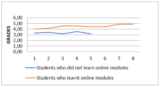 At the stage of evaluating the effectiveness of the course, we need to make sure that the online course makes the learning process more effective. For this, we use the Pearson correlation coefficient (Pearson’s r). Table 4 shows the grade point average (a five-point academic grading system) of the experimental group of master’s students, some of whom learned the modules of Part 1 of the online course. The students who did the modules are coded as 2 and those who did not are coded as 1.