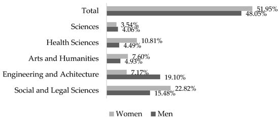 The study population included all undergraduate students enrolled at the University of Seville during the 2019/2020 academic year, a total of 48,039 students []. To calculate the sample, the formula for infinite populations (>10.000 subjects) was used: n = z2 P ∗ Q/E2. With a margin of error of 3.3% for a 97% confidence interval, a total of 1478 students were obtained. Simple random sampling with proportional allocation according to sex and field of study was used (Figure 1). The demographic characteristics of the sample can be seen in Table 1.