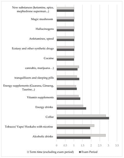 The present study accomplishes the first research objective by analysing the perceptions of students at the University of Seville on legal and illegal drug use according to the period of the academic year (term time or exam periods). It is identified that numerous students consider that they usually drink coffee, which increases during exam periods, as does the consumption of energy drinks. These results coincide with those presented by Khalil and Antoun [] in which students report consuming more caffeine during exam periods, which in turn is associated with alcohol consumption, smoking and the appearance of symptoms of stress.